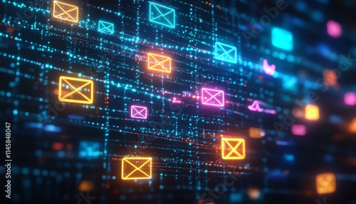 Colorful email, message, and technology icons on a dark background, representing digital communication and social media connectivity