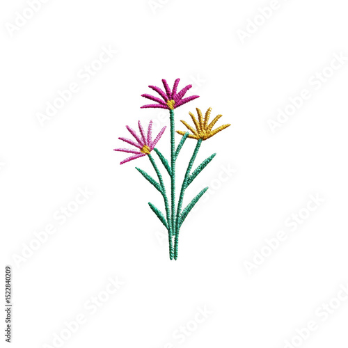Colorful embroidered flowers with green stems transparency background, showcasing intricate stitching and vibrant hues. design features pink and yellow petals, creating lively and artistic floral