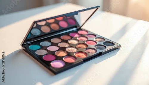 Colorful eyeshadow palette with lots of vibrant shades in sunlight on white table. Spring makeup, preparation for parties, night out, events, carnival or festival makeover. Shopping for cosmetics
