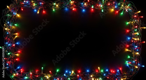 Colorful festive string lights in dark framed background