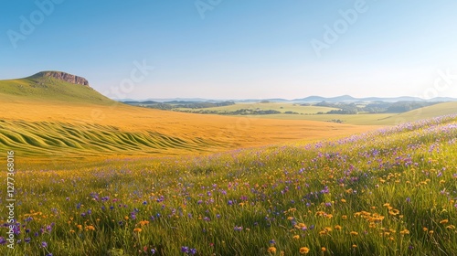 Colorful field of wildflowers in a golden meadow with green grass under a clear blue sky