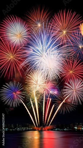 Colorful fireworks exploding in the night sky over a dark silhouette of a city skyline.