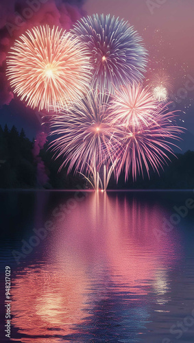 colorful fireworks exploding over a calm lake background art design backdrop