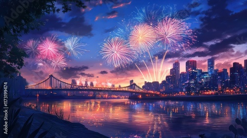 Colorful fireworks illuminate a city skyline over a river at dusk.
