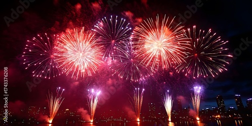 Colorful fireworks light up the night sky during a festive celebration by the waterfront in a bustling city