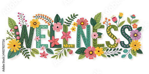Colorful Floral Wellness Typography — Hand-Drawn Lettering with Vibrant Flowers, Botanical Folk Art Design