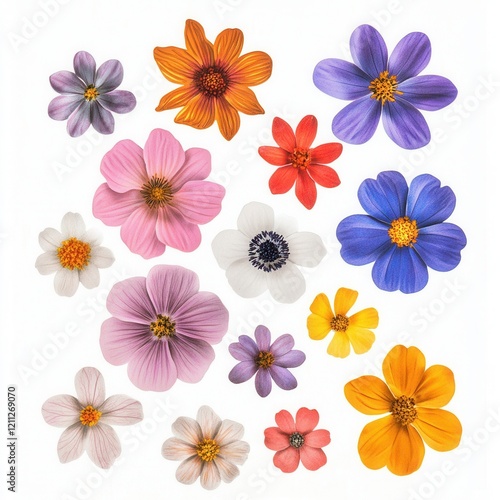 Colorful flower collage, studio shot, white background, design element (1)