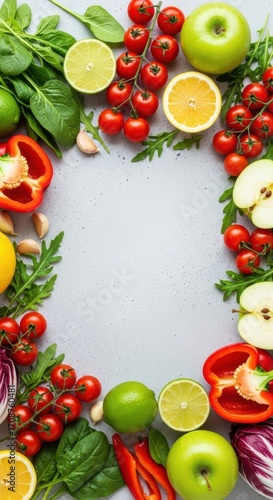 Colorful frame of fresh fruits and vegetables offering healthy lifestyle