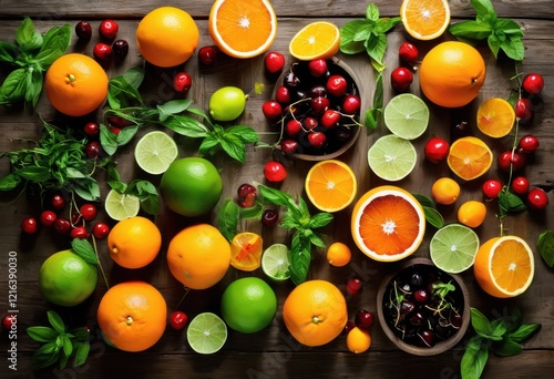 colorful fresh ingredient flat lay display aimed cocktail creation featuring garnishes, fruits, herbs, lime, mint, cucumber, berry, glass, ice, syrup