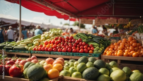 Colorful fresh produce display at bustling outdoor farmers market