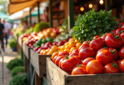colorful fresh produce displayed wooden crates farmers market organic fruits vegetables variety harvest seasonal delight, local, collection, shopping, food