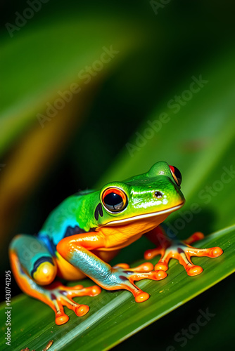 colorful frog on a leaf, close up of a rainforest amphibian