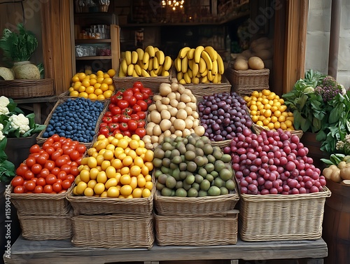 Colorful fruits and vegetables displayed in wicker baskets at a market stall.
