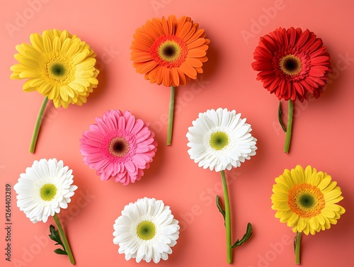 Colorful gerbera flowers on a coral background. Happy Mother's Day concept. Greeting card design template.
