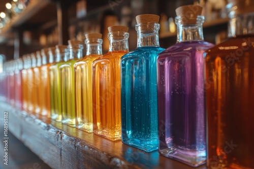 Colorful glass bottles filled with vibrant liquids displayed on a wooden shelf in a market setting