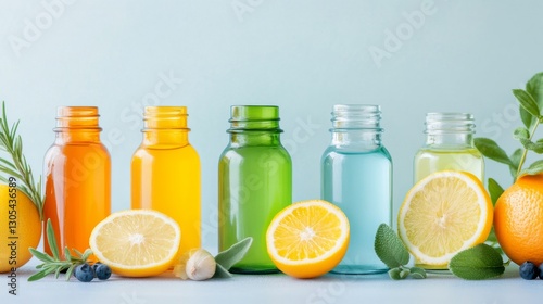 Colorful Glass Bottles with Citrus and Herbs