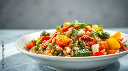 Colorful grain bowl with roasted vegetables on white ceramic plate