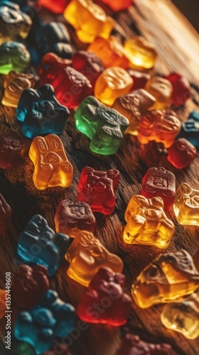 Colorful Gummy Bears on Rustic Wooden Surface Sweet Treat Delightful Confectionery Assortment Close Up Shot Food Photography Bright and Vibrant Colors Delicious and Tempting