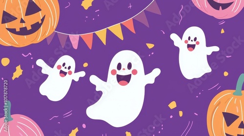 Colorful Halloween Scene with Pumpkins and Ghosts