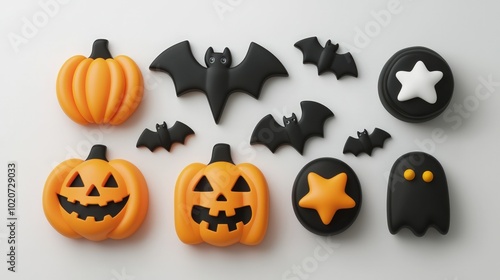 Colorful Halloween-themed decorations including pumpkins, bats, and ghosts, perfect for festive celebrations.