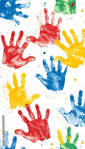 Colorful handprints adorn a white backdrop in joyful disarray