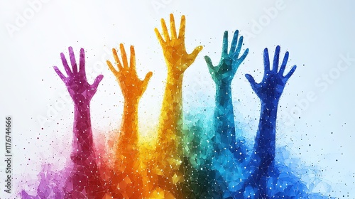 Colorful hands raised in celebration, symbolizing diversity and unity.
