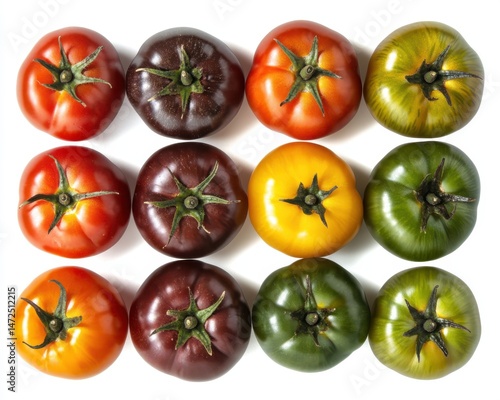 Colorful Heirloom Tomatoes Arranged in Grid on White Background
