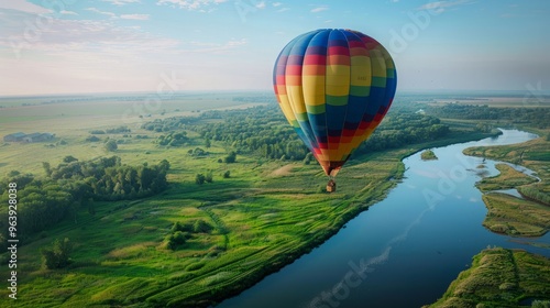 Colorful hot air balloon flying over green field and river