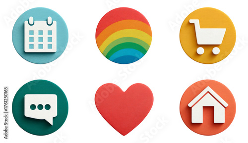 Colorful Icon Set Featuring Calendar, Rainbow, Shopping Cart, Heart, Chat Bubble, and House