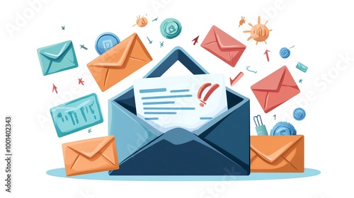 Colorful illustration of an envelope with letters and icons representing digital communication, email marketing, and messaging.