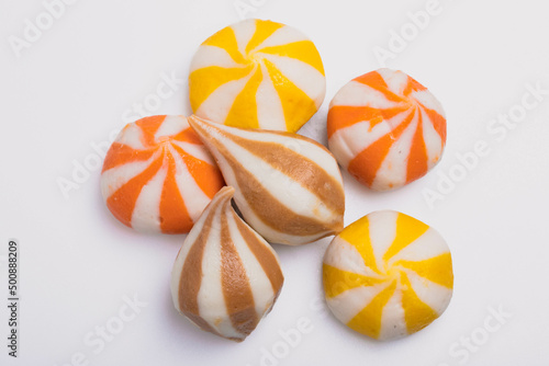 Colorful Japanese style fish balls on a white background.