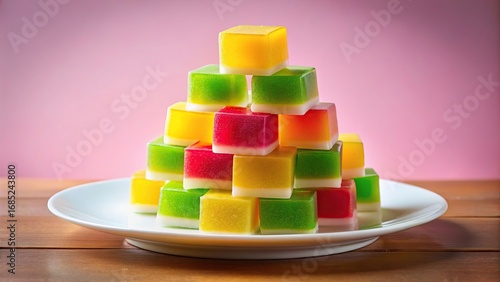Colorful jelly cubes stacked on a white plate