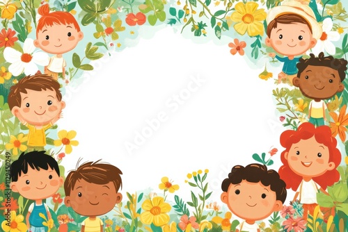 Colorful kids printable background featuring happy children surrounded by flowers and greenery