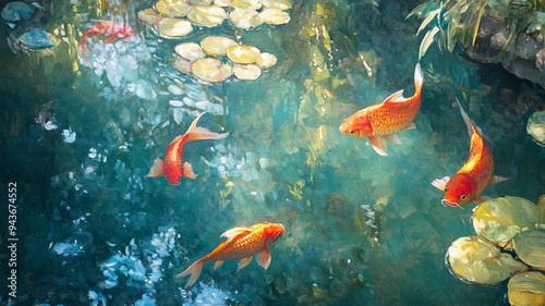 Colorful koi fish swimming gracefully among water lilies in a serene pond at midday, showcasing a tranquil aquatic environment