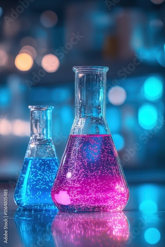 Colorful Laboratory Flasks with Glowing Liquid in a Scientific Research Environment with Bokeh Background