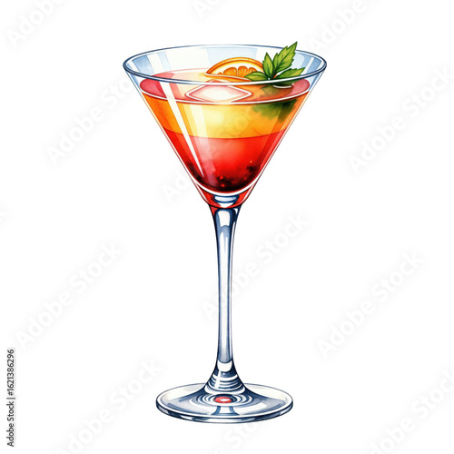 Colorful layered cocktail in a martini glass. Watercolor illustration of a summer drink with orange and mint garnish, isolated on black.