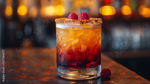 Colorful layered cocktail on a bar with clean lines and vibrant colors