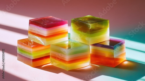 Colorful layered gelatin cubes stacked on a pink surface with vibrant light shadows and reflections