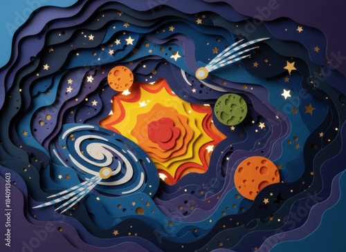 Colorful layered paper cutout of galaxy and solar system with stars and planets