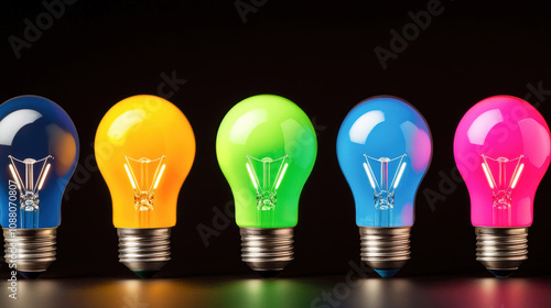 Colorful light bulbs in row, showcasing innovation and creativity. vibrant hues of yellow, green, blue, and pink symbolize diverse ideas and inspiration