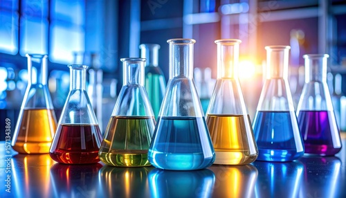Colorful liquids in laboratory glassware for scientific experiments.