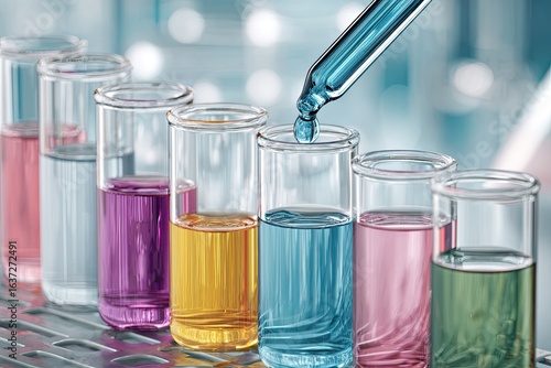 Colorful liquids in test tubes, a pipette adds a drop