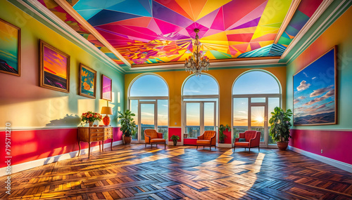 Colorful living room interior with large windows. Generative AI