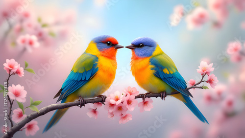 Colorful Lovebirds on a Blossoming Branch with Pastel Sky