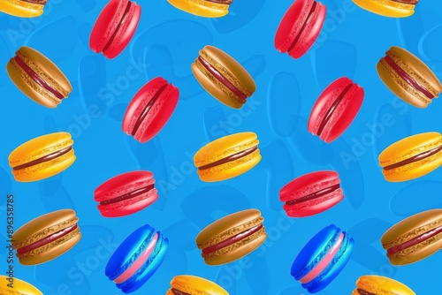 Colorful macarons with chocolate and vanilla filling on a blue background.
