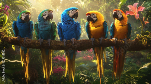 Colorful Macaws Perched on Branch in Tropical Rainforest