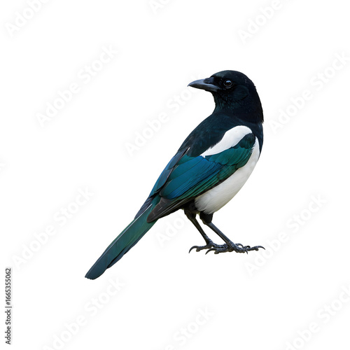 Colorful magpie bird perched isolated on white backround representing wildlife beauty, intelligence, an freedom