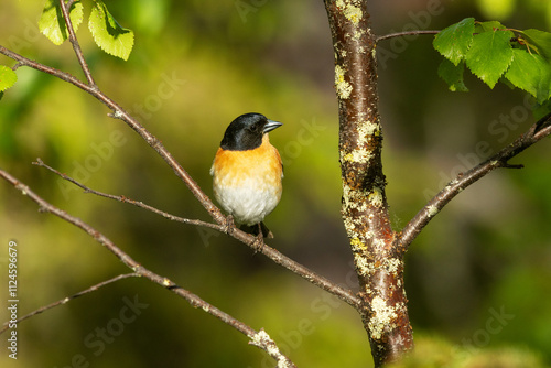 Colorful male Brambling perched on Birch during sunny summer evening in Riisitunturi National Park, Northern Finland