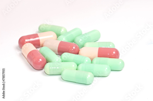 Colorful medical capsules on white background.