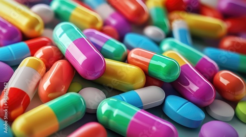 Colorful medicine tablets antibiotic pills on soft background with copy space